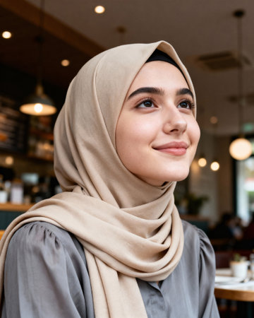 Arabian young muslim woman sitting in a cafe.