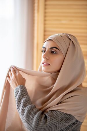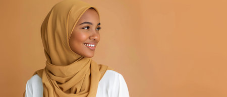 Side portrait of young Arab Muslim woman in strict religious clothes and head covered in hijab looking to the side against beige background with copy space