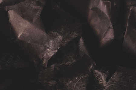 Reflecting light and shadow on creases and folds in scrunched black plastic sheeting. monochrome light and texture, abstract background image.
