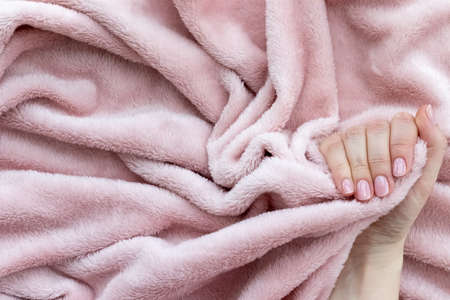 Female hand with beautiful manicure - pink nude nails on crumpled pale pink fluffy fabric, textile background with copy space