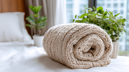 A cozy pink knit blanket beautifully rolled on a bed, adding warmth and style to the interior. Perfect for creating a serene and inviting atmosphere.