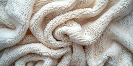 A close-up macro view reveals the intricate, curly fibers of a plush cream-colored wool fabric. The soft, warm texture creates a cozy and inviting atmosphere, perfect for concepts of comfort, luxury, and natural textiles.