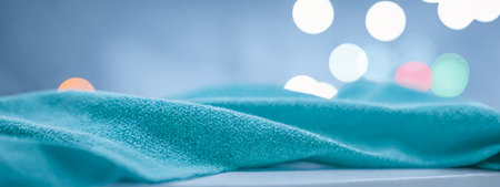Panoramic cosmetic banner showcasing detailed texture of turquoise spa towel, tranquil ambiance with defocused gentle lights in backdrop, hygiene and skincare concept