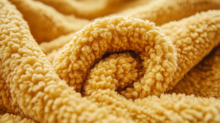 Detailed close-up of golden sherpa fleece fabric with a soft, plush texture and curled folds, perfect for warm and cozy themes.