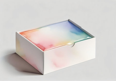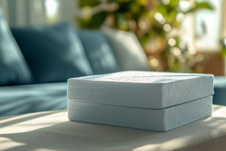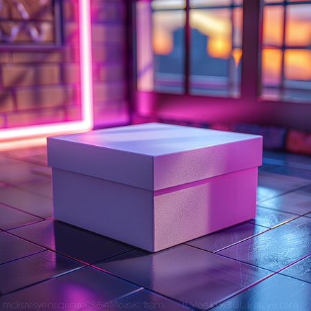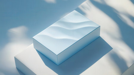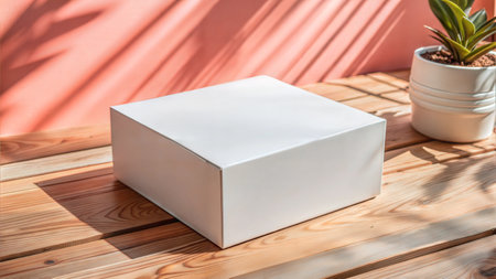 A simple white cardboard box sits on a textured surface, bathed in warm, natural light that casts soft shadows, creating a minimalist and clean aesthetic.