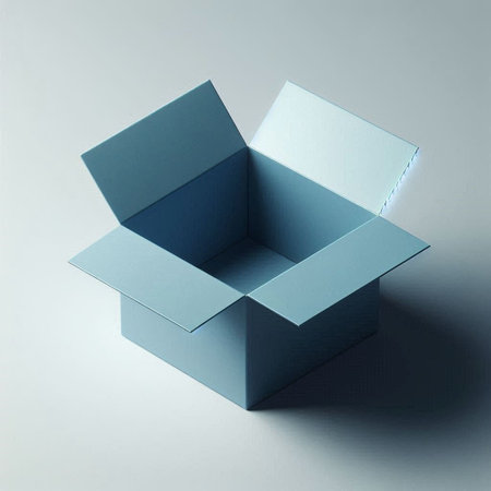 An open cardboard box sits on a teal surface, illuminated by soft light. The uncluttered setting enhances the focus on the box, evoking curiosity about its contents.