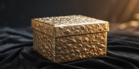 A beautifully wrapped gift box with a luxurious gold ribbon stands out against a soft textured background, ideal for various festive and special occasions.