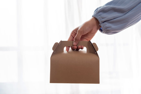 Female hand holding recyclable food box on white background. Mock-ups.