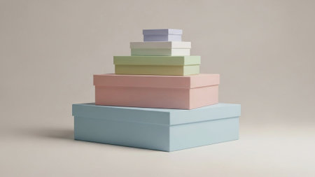 Six pastel-colored rectangular gift boxes stacked in a stepped arrangement on a plain light background. Colors include light blue, pink, olive green, beige, pale purple, and white. The...