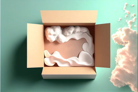 Open cardboard box with clouds in the sky. 3D rendering.