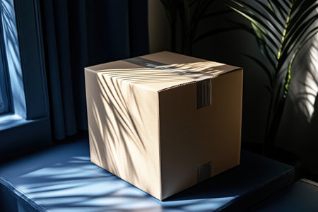 A cardboard box casting shadows in sunlit room with plants Generative Ai