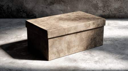 A simple, textured brown storage box rests on a gray surface, illuminated by soft lighting, creating an aura of minimalism and elegance for home organization.