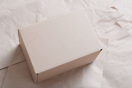 Closed carton box laying on sheets of crumpled kraft paper.