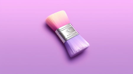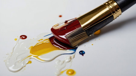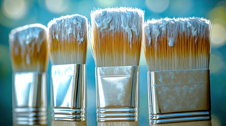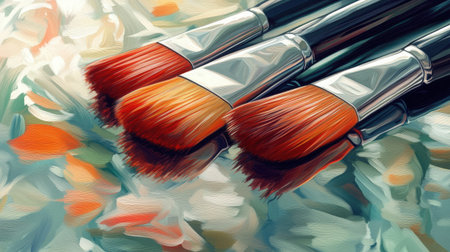 Paintbrushes aligned on a vibrant palette, closeup, soft lighting, colorful artistic backdrop