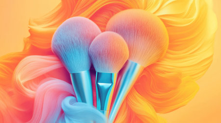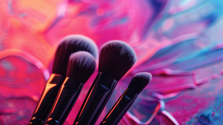 A cluster of various makeup brushes up close, showcasing different shapes and sizes against a colorful backdrop. Generative AI