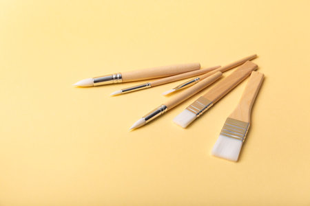 A variety of artist paint brushes laid out on a vibrant background, in art class extracurricular hobby activities at school or college.