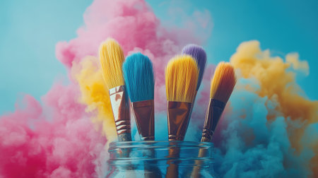 A captivating display of vibrant paint brushes in a jar, surrounded by swirling smoke clouds in pink, blue, and yellow, perfect for artistic themed projects.