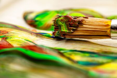 art brushes and paints for painting pictures, oil and other paints with brushes for creativity, the creative process of drawing by mixing different colors of paints with art brushes
