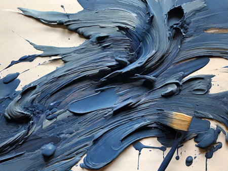 A paintbrush, rich with a vibrant mix of colors, makes its first bold stroke of black paint onto a sleek, reflective surface.