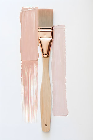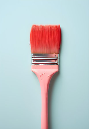 A blue paintbrush with a wooden handle rests against a gradient background of pink and blue