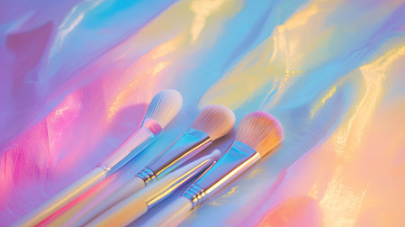 Beautifully arranged colorful makeup brushes on a dynamic pastel background create a captivating visual perfect for beauty themes in photography.