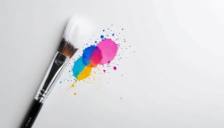 A paintbrush with blue bristles, holding yellow and orange paint, creating vibrant color splashes on a dark navy background. High-quality photograph. Studio lighting. Minimalist stock photography style. The brush is placed at the bottom right of an isolated canvas, with scattered colorful dots representing different colors being applied --chaos 30 --ar 16:9 --stylize 500 --v 6.1 Job ID: 59606c15-0c32-40f8-ade1-3fab8adca5b7