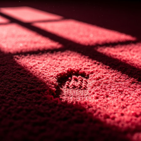 Close-up of a crimson shag rug showing a detailed indentation mark left by a missing object under ha