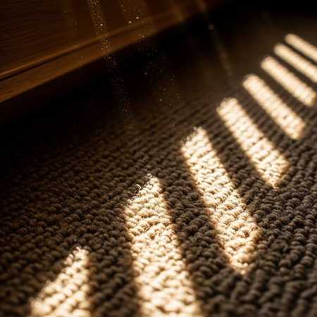 Sharp geometric shadow of a window blind slat cutting across a dusty, aged carpet in harsh sunlight.