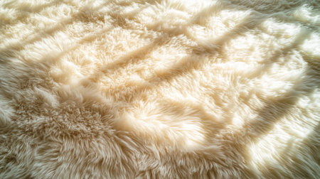 A close-up view of a luxurious faux fur rug in a warm cream color, capturing the soft texture and gentle shadows created by natural light, perfect for cozy indoor settings.