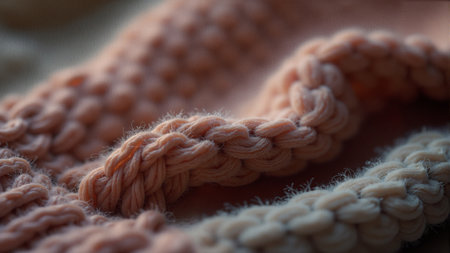 A close-up shot captures the intricate texture of knitted fabric, revealing its delicate weaves and soft hues. The gentle lighting enhances the cozy and inviting feel.