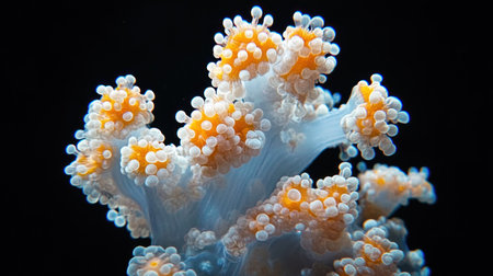 Close-up of a beautiful soft coral with numerous polyps extended, displaying a striking combination of white and orange colors against a deep black background, highlighting its delicate structure and.