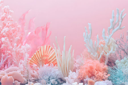 Delicate coral formations in soft pastel colors create a soothing underwater display.