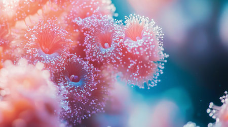 Close-up of colorful coral polyps underwater, displaying vibrant pink and blue hues, ideal for marine life, ocean, and abstract nature themes.
