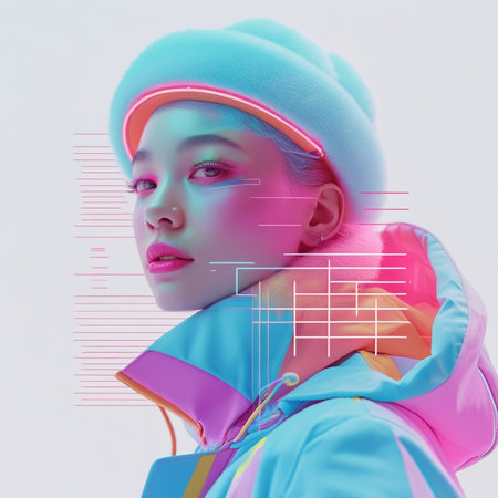 Stylish Young Woman in Trendy Streetwear Against Vibrant Background