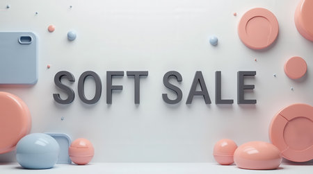 A visually appealing arrangement presents promotional text announcing a soft sale. This setup features soft pastel colors and geometric shapes, creating an inviting atmosphere.
