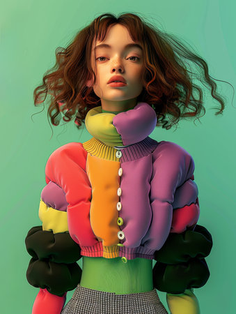 Portrait of a young woman wearing a colorful pastel windbreaker jacket, posing confidently against a warm gradient background. Casual and stylish concept.