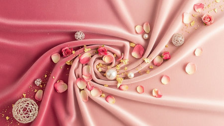 296. showing swirling pink velvet fabric with scattered rose petals pearls and gold flakes keywords: pink, velvet,...