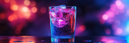 A glowing glass of soda features electric purple and deep blue hues, surrounded by a futuristic atmosphere typical of a lively nightlife scene.