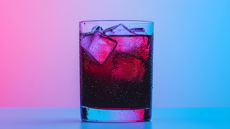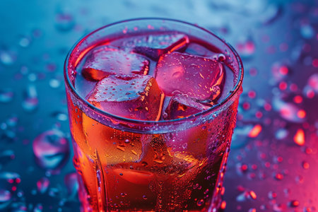 A stunning close-up of a glass filled with carbonated beverage and ice cubes, captures the refreshing quality against a vivid red and blue backdrop.