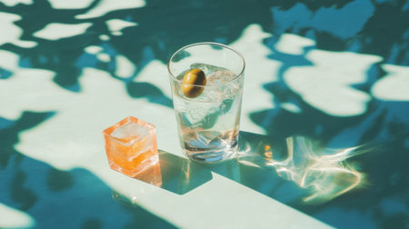 A glass filled with a refreshing cold drink and ice cubes sits on a rustic table, illuminated by soft natural light, creating a perfect summer moment ideal for relaxation.