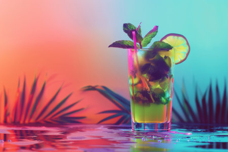 Mojito Cocktail on Neon Background, Mint Tropical Mocktail, Fresh Beach Party Cocktail, Alcohol Summer Bar Drink, Copy Space, Generative AI Illustration