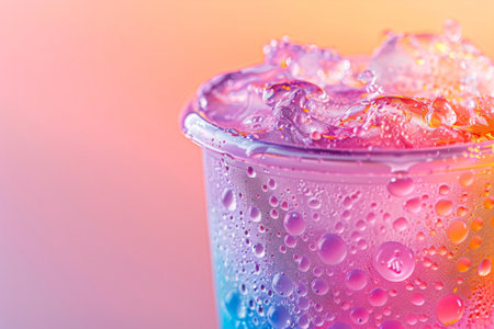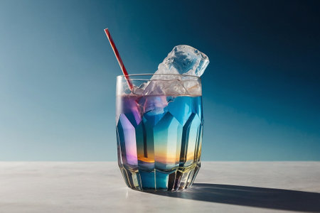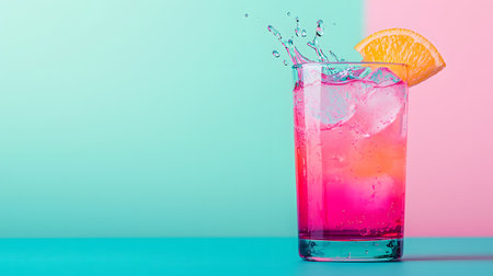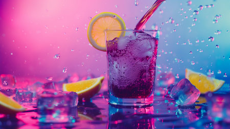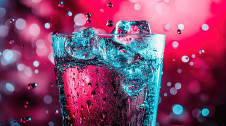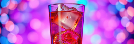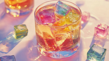A lively composition featuring a vibrant cocktail with ice cubes, styled under bold and colorful lighting for a dynamic look.