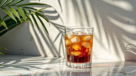 Refreshing glass of iced coffee with sunlit shadow of palm leaves. That the image is generated using AI.