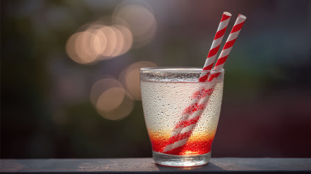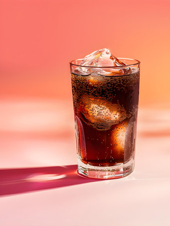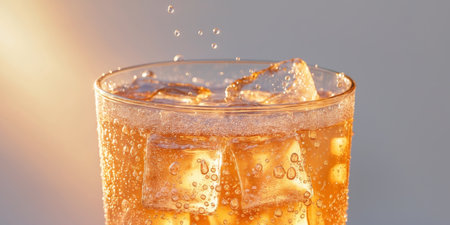 AI Generated. Close up of refreshing iced soda with bubbles and ice cubes in golden sunlight