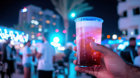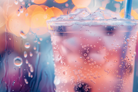 A vibrant glass of soda filled with ice catches the eye with neon colors and futuristic aesthetics, set against a backdrop of urban lights in a cyberpunk style.