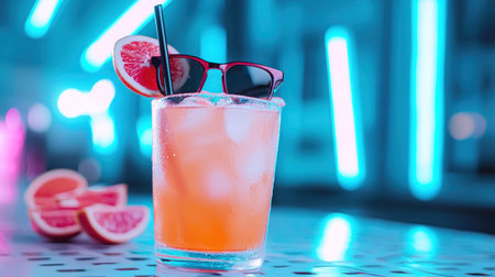 A vibrant grapefruit cocktail, garnished with a slice of grapefruit and a pair of stylish sunglasses, features a black straw and ice cubes, ready for a summer day.