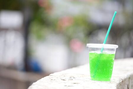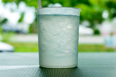 Soft drink in plastic glass on wooden table with green nature background