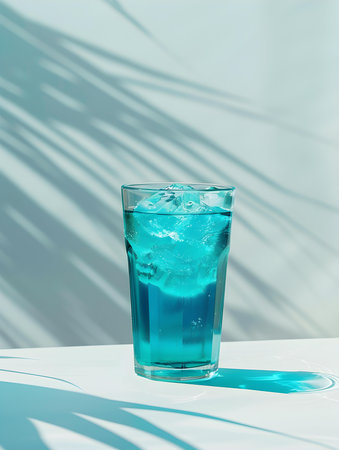 Cyan Summer Drink on a light Background with Sunlight and Shadows