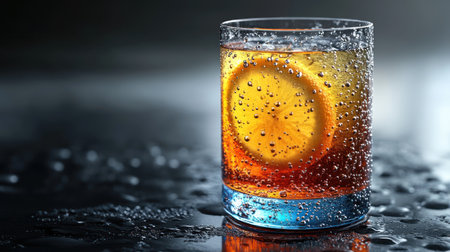 A glass filled with a beverage and a lemon slice is the central focus, placed on a surface with water droplets. The drink displays a gradient of colors. The composition utilizes backlighting, casting reflections. This image suits various commercial applications, including editorial content and promotional materials.