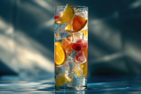 A tall glass filled with ice cubes and colorful fruit slices, creating a refreshing summer beverage